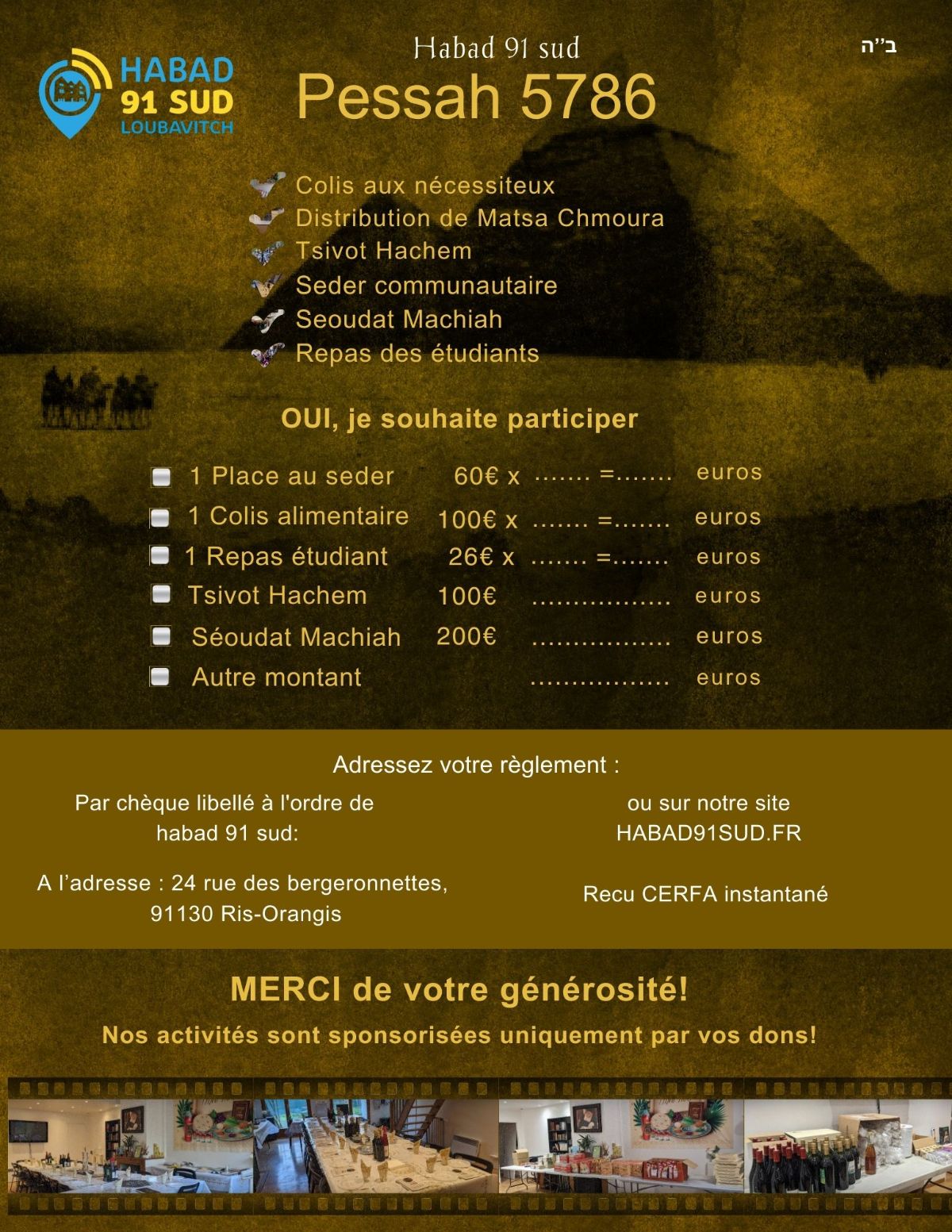 Participation de soutien. Réservez votre place du seder en contribuant largement et soutenir ce projet. (Min: 1€)
